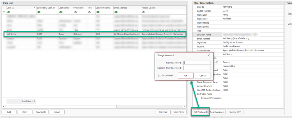 On the prompt that comes up, type the new password into the fields and press OK, leaving the Force Reset box checked.