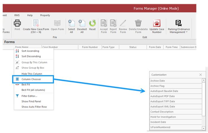 By default, TraCS will sort the form list by date.   To sort by form name, form number, or any other column, click the column header. To reverse sort, click it again.   You may also right click on the column you want and choose Sort Ascending or Sort Descending.