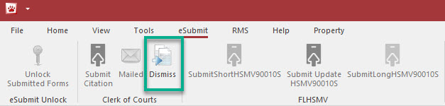 Once you receive notification from the COC or SAO of a dismissal or nolle prosequi, highlight the citation you wish to dismiss and press the Dismiss button on the eSubmit tab.